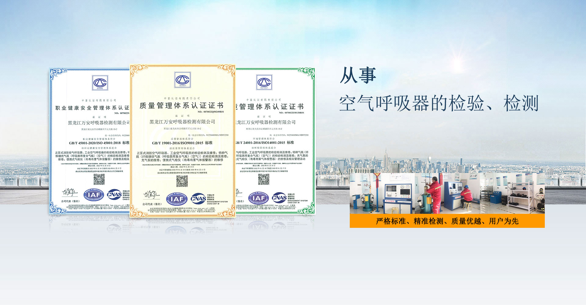 黑龙江万安呼吸器检测有限公司成立于2017年4月,主要从事空气呼吸器的检验、检测;碳纤维全缠绕铝合金内胆气瓶的检验、检测、检定及充装(空气);钢质气瓶的检验、检测、检定;气检仪和安全阀的检验、检测。公司引进德国先进高压空气压缩机等设备,设备完全符合国家安全标准GB24161-2009、XF124-2013、AQ/T6110-2012等国家标准、在空气呼吸器检测等方面云集了一批拥有丰富知识和丰富的实践经验的技术人员。